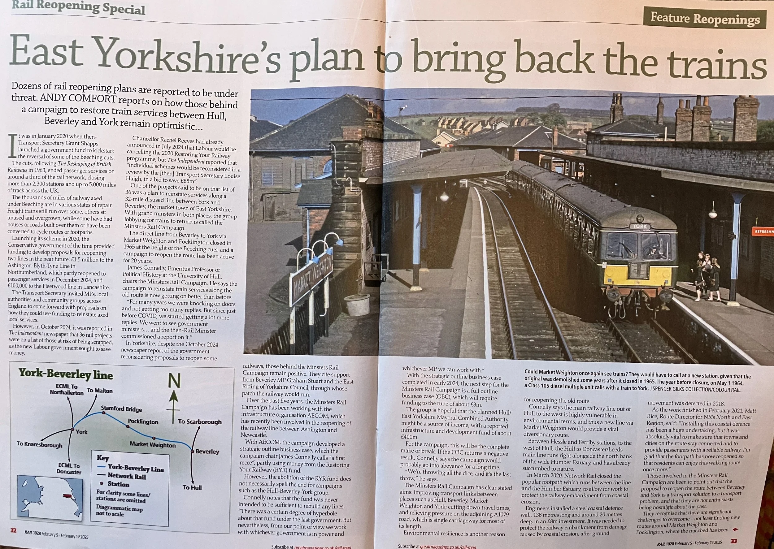 East Yorkshire’s plan to bring back the trains. An article in Rail magazine by Andy Comfort about the reinstatement of the Beverley to York railway and the Minsters Rail Campaign.